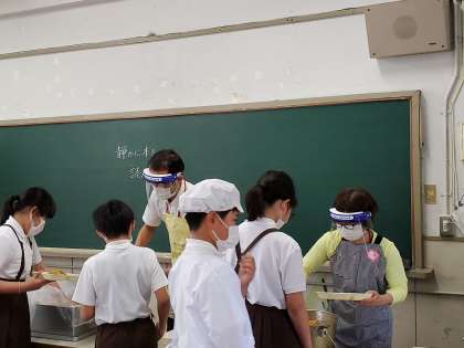 先生方もフェイスシールドを着けて配膳