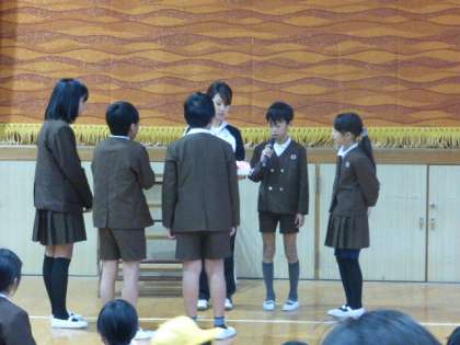 12月1日(月)師走になりました。今日は暖かい朝になりましたが、明日からはすいぶん寒くなるそうです。月曜日の全校朝会では、先日の全校遠足のオリエンテーリングでよい成績をおさめた班に手製のメダルがプレゼントされました。