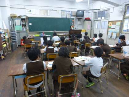 2年生は、音楽の時間に「ぷっかりくじら」や「どこかで」という曲でうたごえを聞きながら歌う学習をしていました。