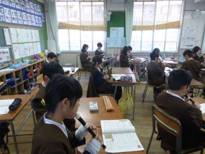 12月5日(金)朝方は曇り空でしたが、だんだんよいお天気になってきました。今日も寒い朝になりました。5年生は、音楽の学習で「キリマンジャロ」の曲をリコーダーで練習していました。