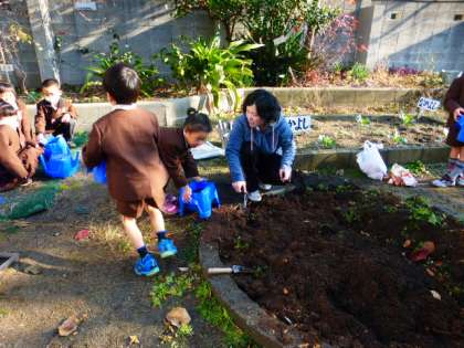 12月8日(月)今朝も寒い朝となりました。けれども昼間は少し暖かくなるようです。1年生は、生活科の時間に、チューリップの球根を植えるために、植木鉢に土を入れていました。