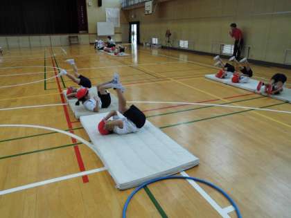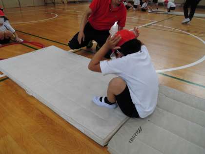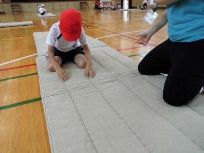 1年生はマット運動をしています。今日は後転を練習しました。先生に補助してもらう場面もあり、一人でできる場面もあり、一人ひとりよくがんばって挑戦していました。