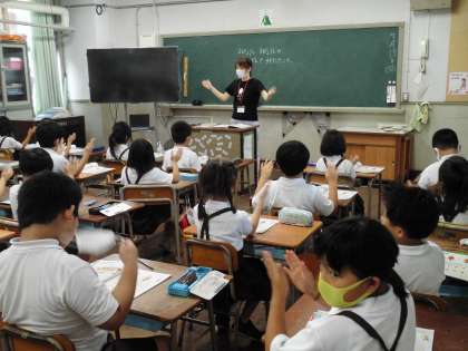 2年生は音楽で、リズムの勉強をしました。「橋の上で」という曲に合わせて、手をたたくところと休むところを交互に行い練習しました。