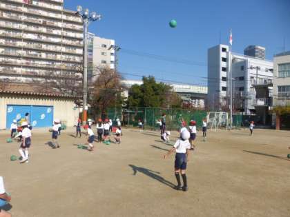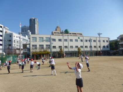 1年生は、体育の時間のボールを投げる運動遊びをしました。この時間には気温が上がり、快適に運動ができました。
