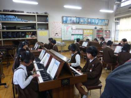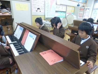 4年生は、音楽の時間に音楽室で電子オルガンを使って「オーラ・リー」という曲を練習していました。