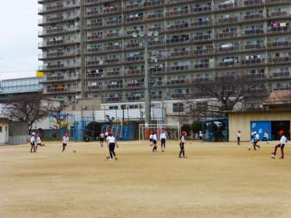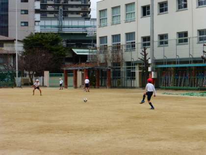 3年生は、寒さに負けずに体育の時間に運動場でサッカーをしていました。