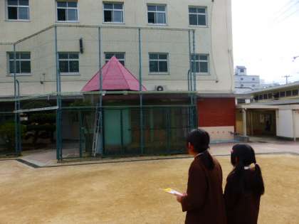 3年生は、算数の時間に運動場に出て、学校にある三角形を探していました。