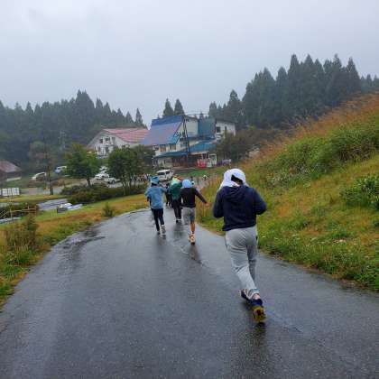 大広間のある隣の宿舎まで霧雨の中