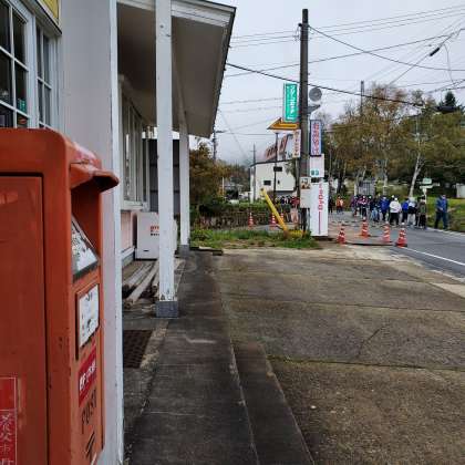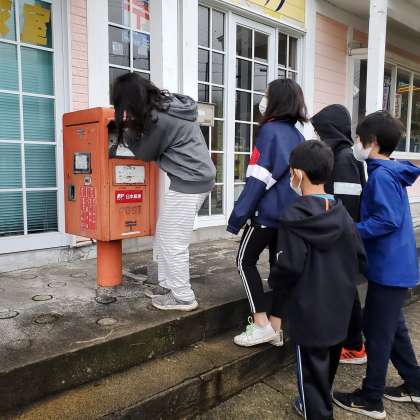 朝の集いの後、昨日濡れたジャンパー等を着て、ポストまで朝のお散歩