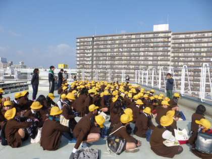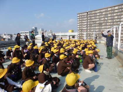 地震と津波の避難訓練もしました。まず、運動場に避難してから、津波を避けるために体育館の屋上に避難しました。