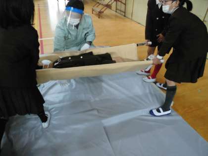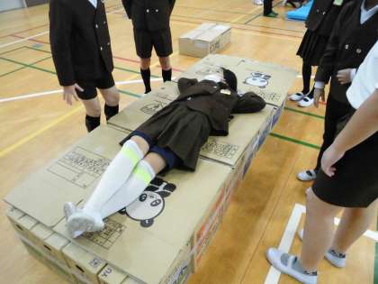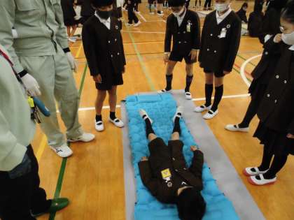 1月16日、土曜授業で防災学習を行いました。磯路地域活動協議会と株式会社リングの皆様にご協力をいただきました。避難所生活で寝やすいようにするための段ボールベッドや、毛布を利用した担架での搬送を体験しました。