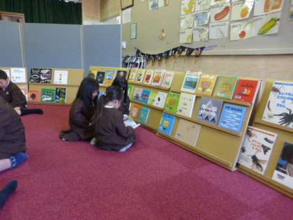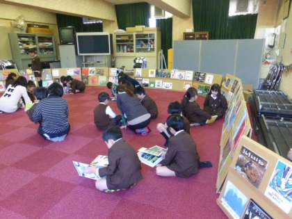 面展台にはたくさんの絵本がならんでいます。みんなで絵本を楽しく読みました。