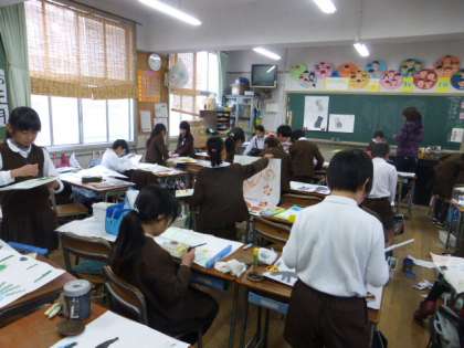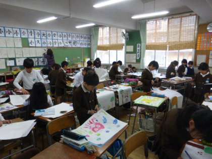 2月12日(木)昨日に引き続き、今日も少し暖かくなりました。3年生は、図画工作の時間に版画をしていました。