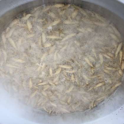 今日の給食は「わかさぎフライ、はくさいのスープ、カリフラワーのサラダ、黒糖パン、牛乳」です。わかさぎは、ししゃもと同じキュウリウオ科の魚です。みんな頑張って骨も丸ごとたべていました。