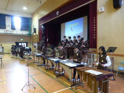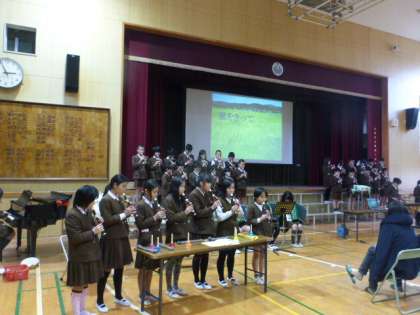 6年生は、卒業を前に国語(詩の暗唱)、音楽(合奏、合唱)、体育(長縄跳び)で1年間学んできた成果を発表しました。合奏の様子です。
