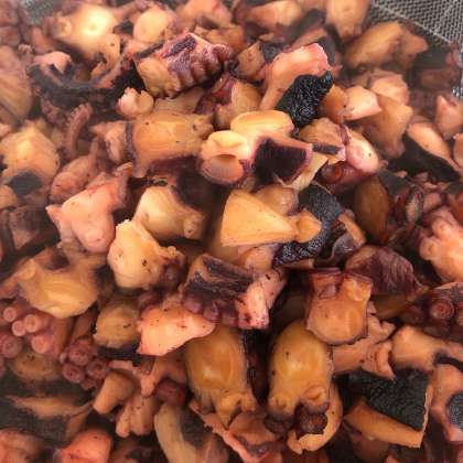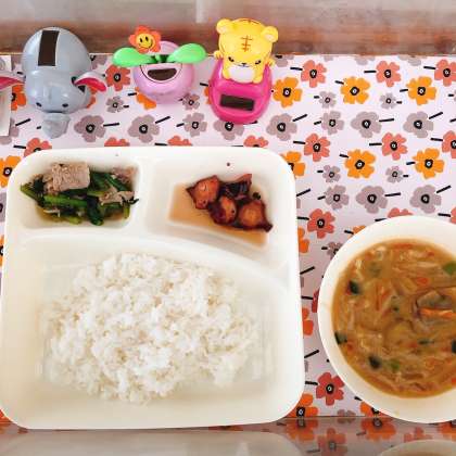 今日の給食は「泉だこのやわらか煮、みそ汁、こまつなの煮びたし、ごはん、牛乳」です。「泉だこ」は大阪湾の泉州沖でとれるマダコです。とてもやわらかくておいしいタコでした。