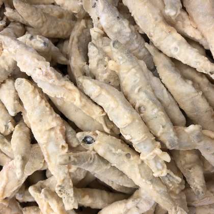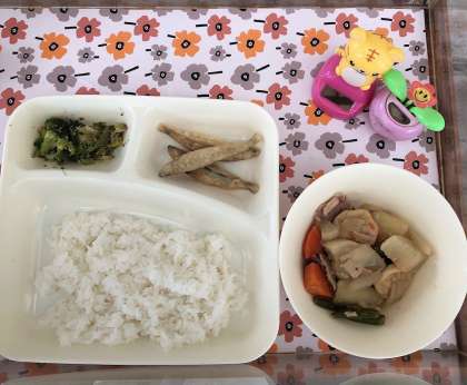 今日の給食は「きびなごてんぷら、一口がんもとじゃがいもの煮もの、ブロッコリーのごまあえ、ごはん、牛乳」です。きびなごは、体の横に銀色と青色の帯のような模様があります。鹿児島県の南部では、帯のことを「キビ」ということから、「帯(きび)の小魚(なご)」から「きびなご」と呼ばれるようになったといわれています。