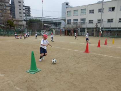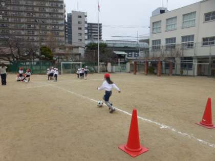 2月17日(火)少し暖かくなったかと思うと、寒い日が続きます。春までもう少しのようです。1年生は、運動場で体育の学習のボールけり遊びをしていました。