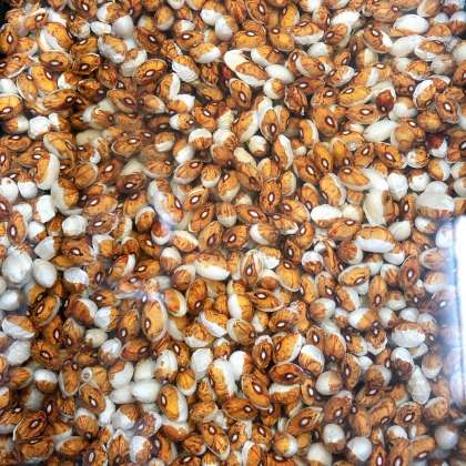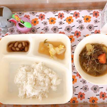 今日の給食は「肉じゃが、はくさいのゆず風味、とら豆の煮もの、ごはん、牛乳」です。とら豆は、いんげん豆の仲間で、半分は白く、半分はうす茶色のもようが、とらに似ていることから、「とら豆」という名前がつきました。30分熱湯にひたしてから、90分焼き物機で煮ます。左端の写真がとら豆です。