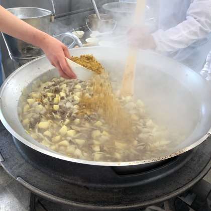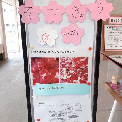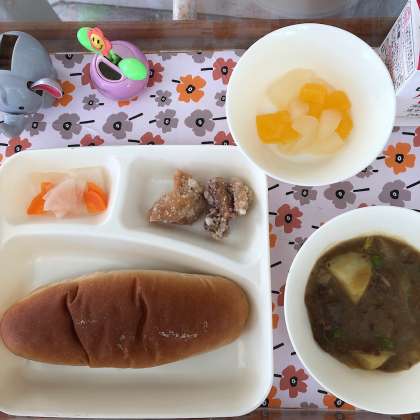 今日の給食は卒業祝い献立で「フライドチキン、カレーシチュー(近江牛)、おいわいピクルス、フルーツゼリー、黒糖パン、牛乳」でした。卒業祝い献立には6年生の卒業をお祝いする気持ちが込められています。