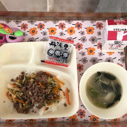 今日の給食は「ビビンバ、トック、いり黒豆、牛乳」でした。ビビンバは、春と秋の年2回登場する献立です。春のビビンバは、大根のかわりに切り干し大根を使用しています。