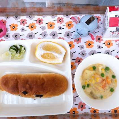 5/12の給食は「コーンクリームシチュー、キャベツときゅうりのサラダ、かわちばんかん、レーズンパン、牛乳」でした。「かわちばんかん」は、熊本県河内町で発見された、みかんの仲間です。「きょうのみかんは、すっぱくない!」とこどもたちにも好評でした。