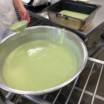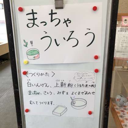 5/19の給食は「かやくご飯、みそしる、まっ茶ういろう、牛乳」でした。「まっ茶ういろう」は、白いんげんピューレ、上新粉(うるち米の粉)、まっ茶、砂糖、水をよく混ぜ合わせ、蒸します。白いんげんピューレーは、国産白いんげんをゆでた後、細かく破砕したものです。新茶の季節に、おいしい「ういろう」でした。