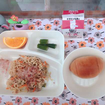 6/16の給食は「和風やきそば、オクラの甘酢あえ、オレンジ、黒糖クレセントロールパン、牛乳」でした。
