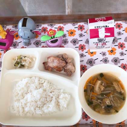 7/1の給食は「鶏肉のしょうゆマヨネーズ焼き、五目汁、切り干し大根のゆずのかあえ、ごはん、牛乳」でした。
