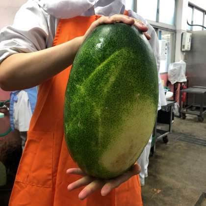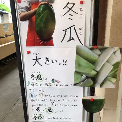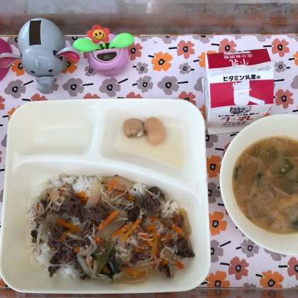 7/2の給食は「牛丼、とうがんのみそ汁、白花豆の煮もの、牛乳」でした。今日のとうがんはとっても大きかったです。