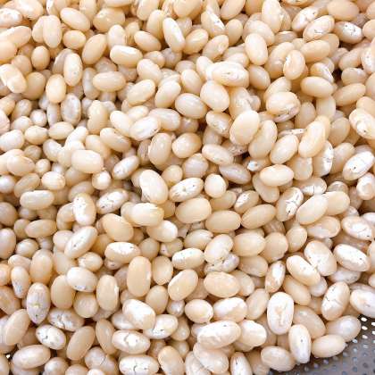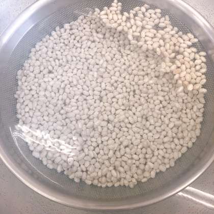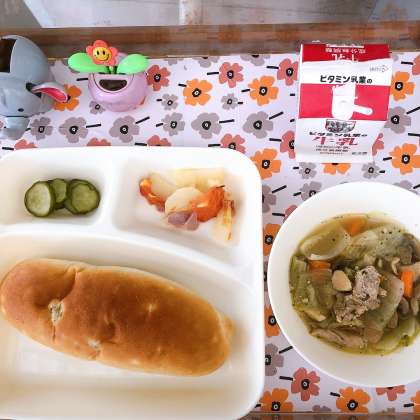 7/5の給食は「鶏肉とてぼ豆のスープ煮、じゃがいもとトマトのチーズ焼き、きゅうりのサラダ、おさつパン、牛乳」でした。「てぼ豆」は熱湯につけておき、柔らかくなるまで煮たものをつかっています。写真左は、熱湯につけているもの、写真中央は柔らかくまで煮たものです。