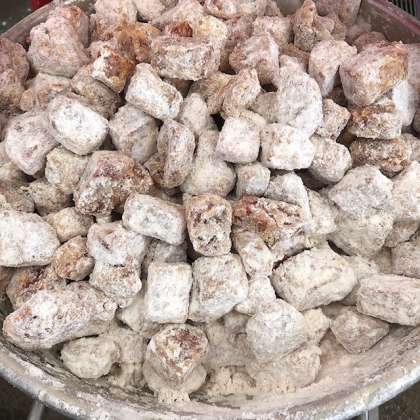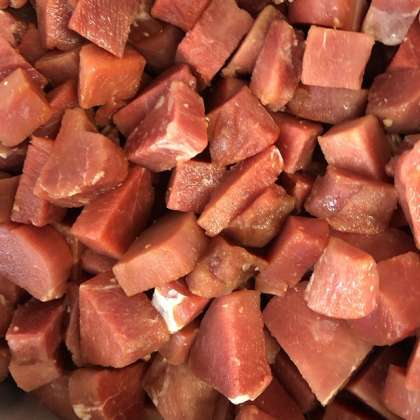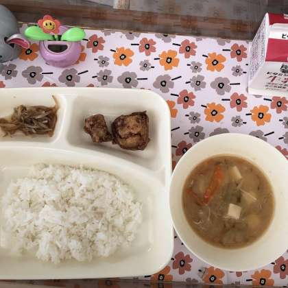 7/6の給食は「豚肉の香味あげ、みそ汁、もやしのおひたし、ごはん、牛乳」でした。「豚肉の香味あげ」は豚肉にしょうが汁、料理酒、こいくちしょうゆ、で下味をつけ(写真左)、でんぷんをまぶし(写真中央)、油であげます。