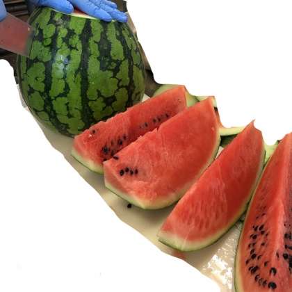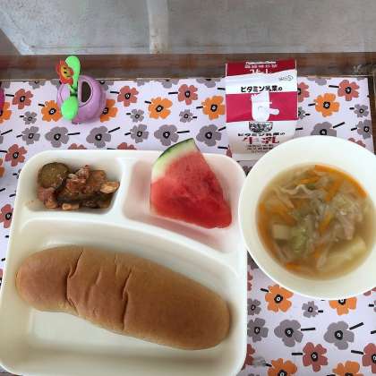 7/7の給食は「鶏肉の夏野菜のソテー、押麦のスープ、すいか、黒糖パン、牛乳」でした。