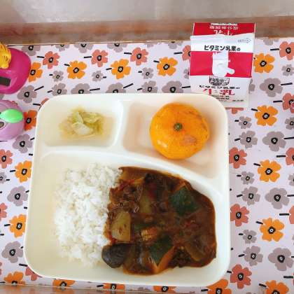 7/8の給食は「夏野菜のカレーライス、キャベツのサラダ、みかん(冷)、牛乳」でした。