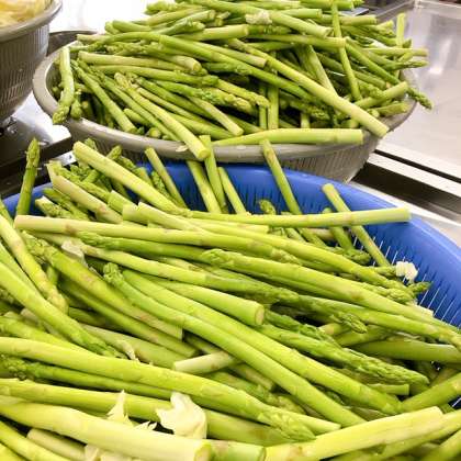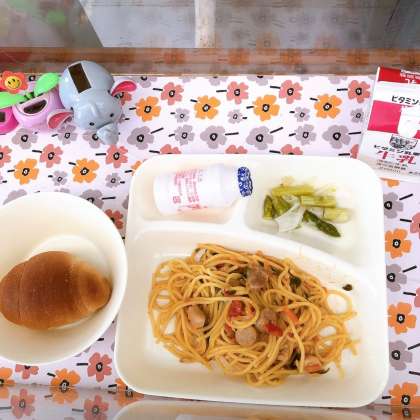 7/12の給食は「チキントマトスパゲッティ、グリーンアスパラガスとキャベツのサラダ、黒糖クレセントロールパン、発酵乳、牛乳」でした。