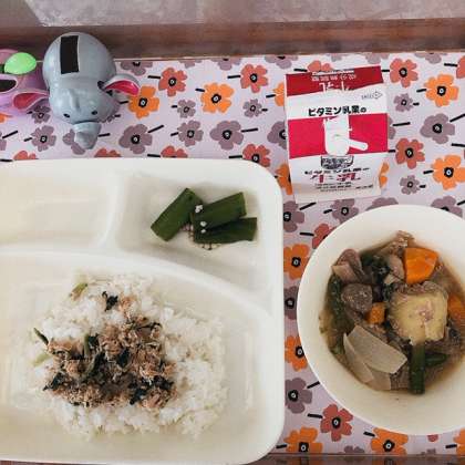 7/15の給食は「ぶた肉とじゃがいもの煮物、オクラの梅風味、ツナっ葉いため、ごはん、牛乳」でした。