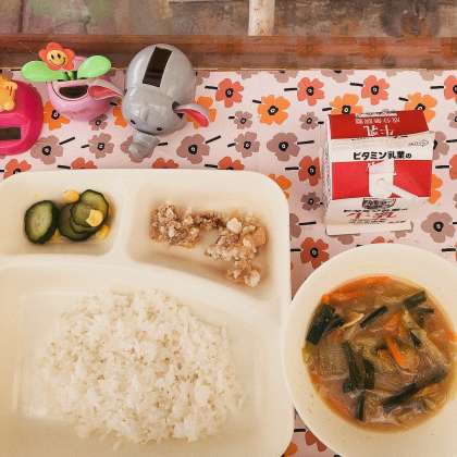 7/16の給食は「けい肉のからあげ、中華みそスープ、きゅうりとコーンの甘酢あえ、ごはん、牛乳」でした。