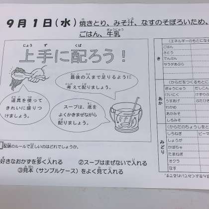9/1の給食は「焼きとり、みそしる、なすのそぼろいため、ごはん、牛乳」でした。