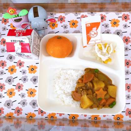 9/8の給食は「チキンカレーライス[米粉]、キャベツとコーンのサラダ[ノンエッグドレッシング]、冷凍みかん、牛乳」でした。