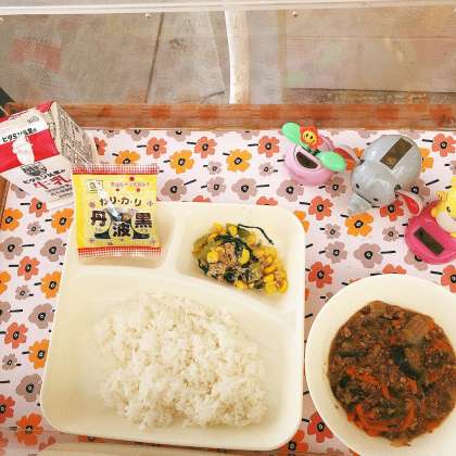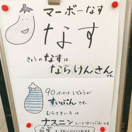 9/10の給食は「マーボーなす、ツナとチンゲンサイのいためもの、いり黒豆、ごはん、牛乳」でした。