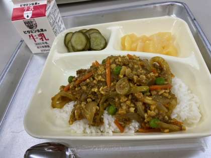 9/28の給食は「大豆入りキーマカレーライス[こめこ]、きゅうりのピクルス、白桃(カット缶づめ)、牛乳」でした。
