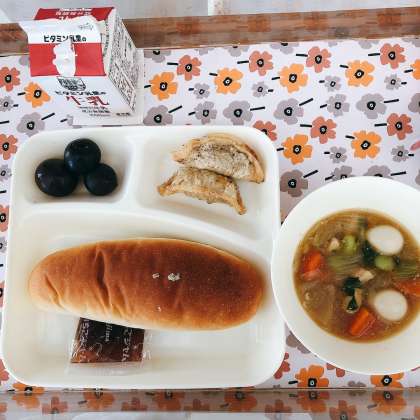 9/29の給食は「あげぎょうざ、中華煮、ぶどう(巨峰)、コッペパン、いちごジャム、牛乳」でした。