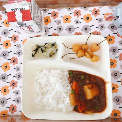10/1の給食は「ハヤシライス[こめこ]、キャベツのひじきドレッシング、さくらんぼ(缶づめ)、牛乳」でした。