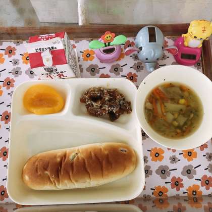 10/20の給食は「なすのミートグラタン、鶏肉と野菜のスープ、黄桃(缶づめ)、おさつパン、牛乳」でした。