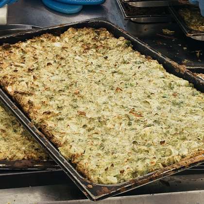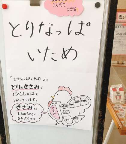 11/2の給食は「お好み焼き、豚汁、とりなっぱいため、ごはん、牛乳」でした。写真右端の写真は焼きあがったお好み焼きです。これを切り分けて配缶しています。