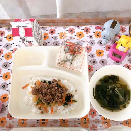 11/8の給食は「ビビンバ、わかめスープ、アーモンドフィッシュ、牛乳」でした。