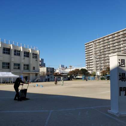 運動場では、担任の先生以外の教職員が急ピッチで整地作業を進めています