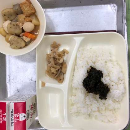 11/15の給食は「関東煮、れんこんの梅風味焼き、のりのつくだ煮、ごはん、牛乳」でした。