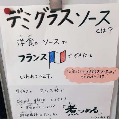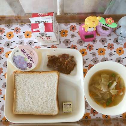11/26の給食は「豚肉のデミグラスソース、スープ、ぶどうゼリー、食パン、バター、牛乳」でした。