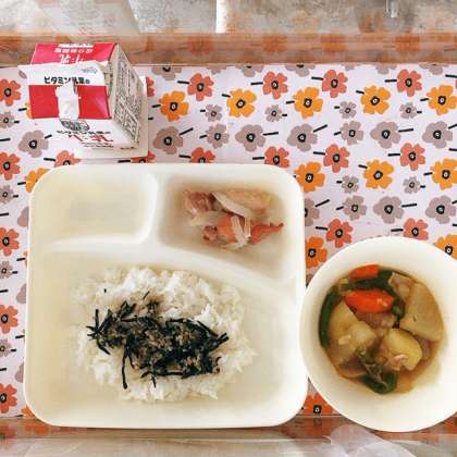 12/14の給食は「けい肉のゆず塩焼き、含め煮、魚ひじきそぼろ、ごはん、牛乳」でした。